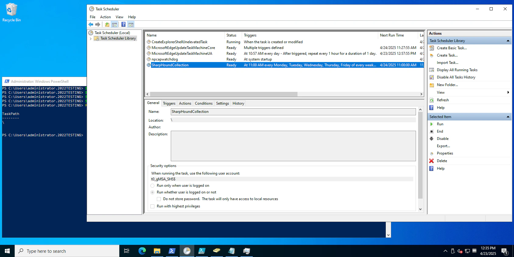 - After refreshing the Scheduled Tasks MMC, you should see the newly created scheduled task that runs as the gMSA account.