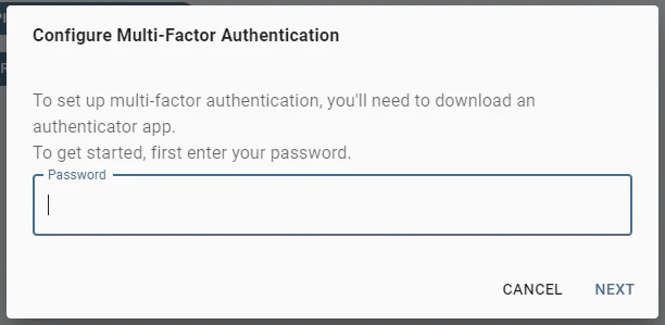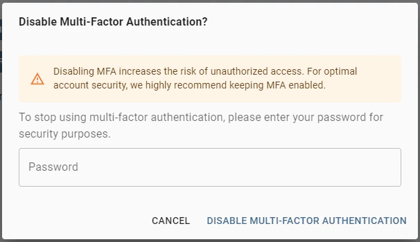 1. In the pop-up, confirm your user’s password and click on Disable Multi-Factor Authentication