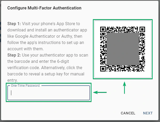 1. Scan the QR code with your multi-factor authentication application, enter the 6-digit one-time password, and click Next