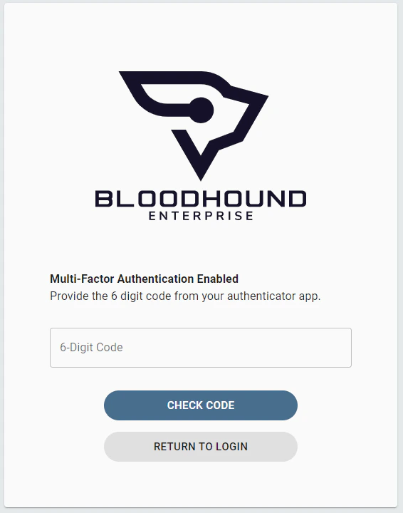 If enabling MFA, next time you log in, you’ll need to use both your password and authentication code. If you lose your authentication code device, you’ll need to contact an Administrator of your BloodHound tenant who can reset your MFA configuration.