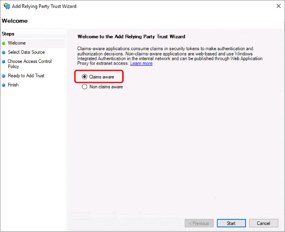 1. Choose “Claims aware” and click “Start”.
