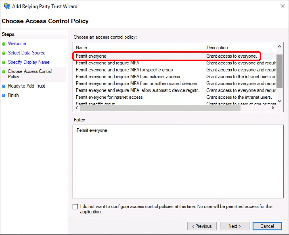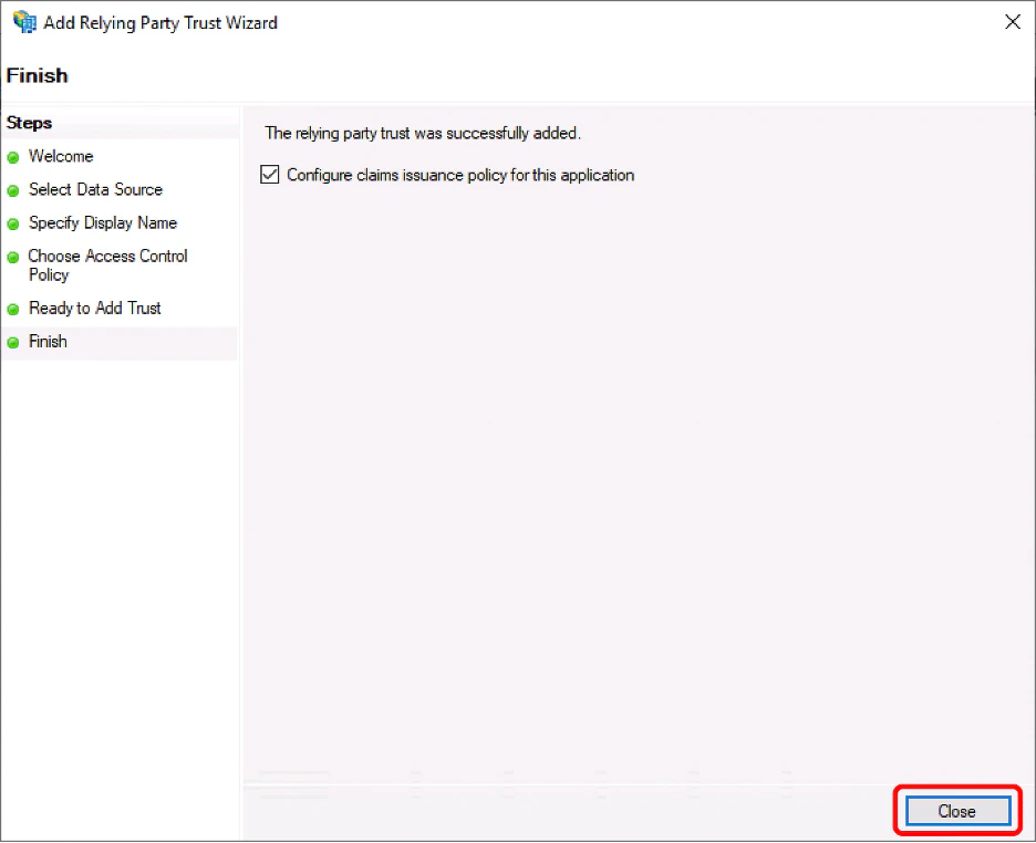 1. Leave the “Configure claims issuance policy for this application” box checked and click “Close”.