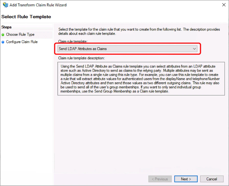 1. Choose “Send LDAP Attributes as Claims” and click “Next.