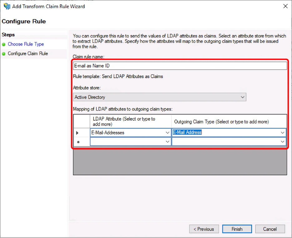 1. Fill out the following and click “Finish”. LDAP Attribute: E-Mail-Addresses Outgoing Claim Type : E-Mail Address