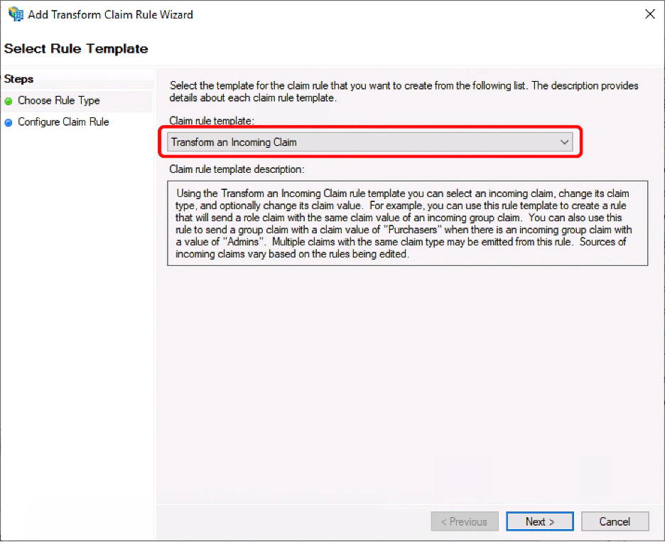 1. Choose “Transform and Incoming Claim” and click “Next”.