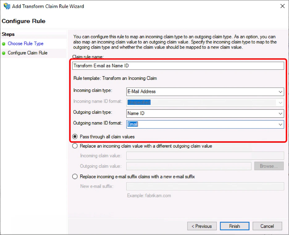 1. Fill out the following and click “Finish”. Incoming claim type: E-Mail Address Outgoing claim type: Name ID Outgoing name ID format: Email Choose “Pass through all claim values”