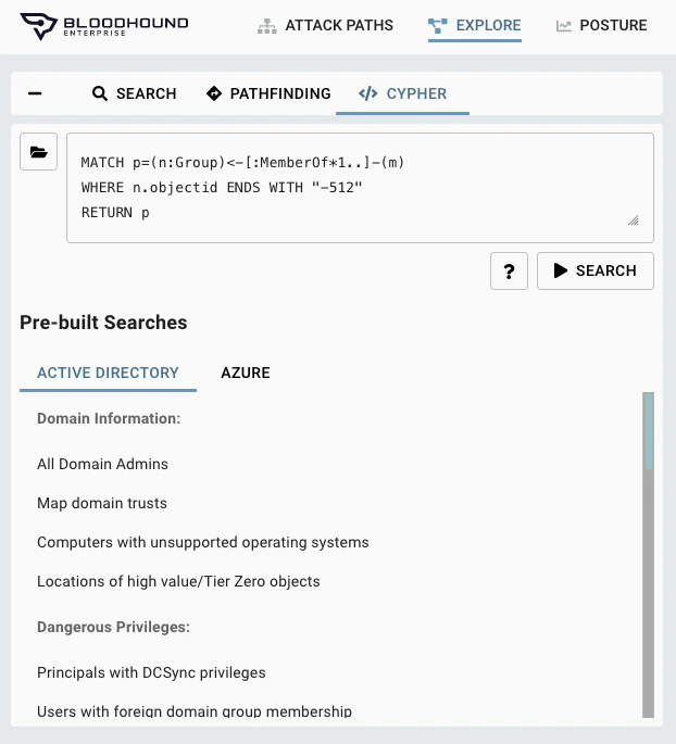 • Open-ended Cypher search - Perhaps the most requested feature of BloodHound Enterprise since we launched is now live! BloodHound Enterprise now supports searches using the openCypher grammar, a query language designed for searching graph-based data. We’ve included several interesting queries to get you started and you can learn more about Searching with Cypher in documentation.