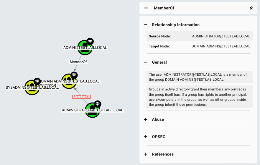 • Edge context menus - Clicking on an Attack Path will now show a contextual menu similar to clicking on an object within BloodHound Enterprise. The displayed menu will include properties about the selected relationship and more in-depth contextual information about the Attack Path itself.