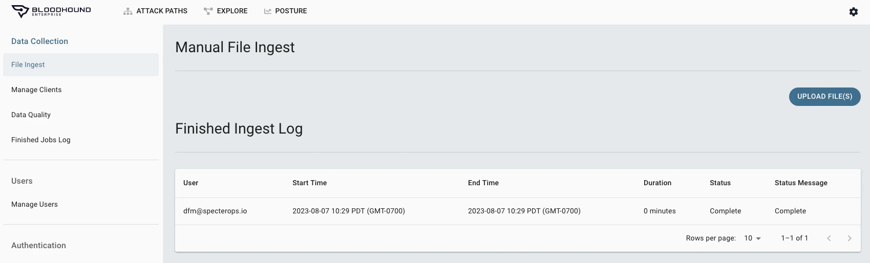 • Offline collection ingest - BloodHound Enterprise now officially supports an easy upload and ingest mechanism for offline collections from SharpHound CE Overview. Whether performing merger and acquisition due diligence or monitoring risk within disconnected networks (such as ICS environments). Uploading offline SharpHound collections is now just a few clicks away under the Administration section.